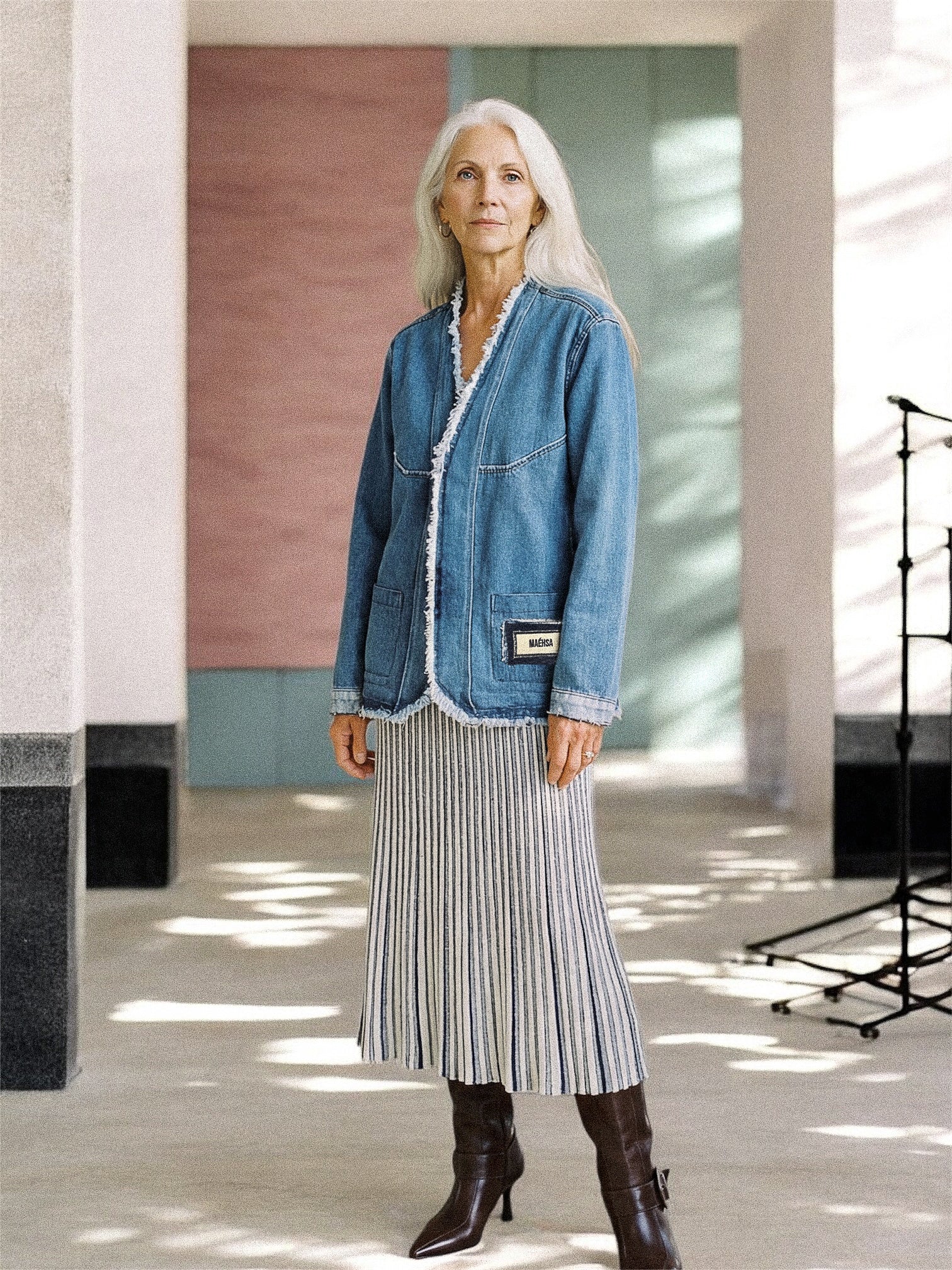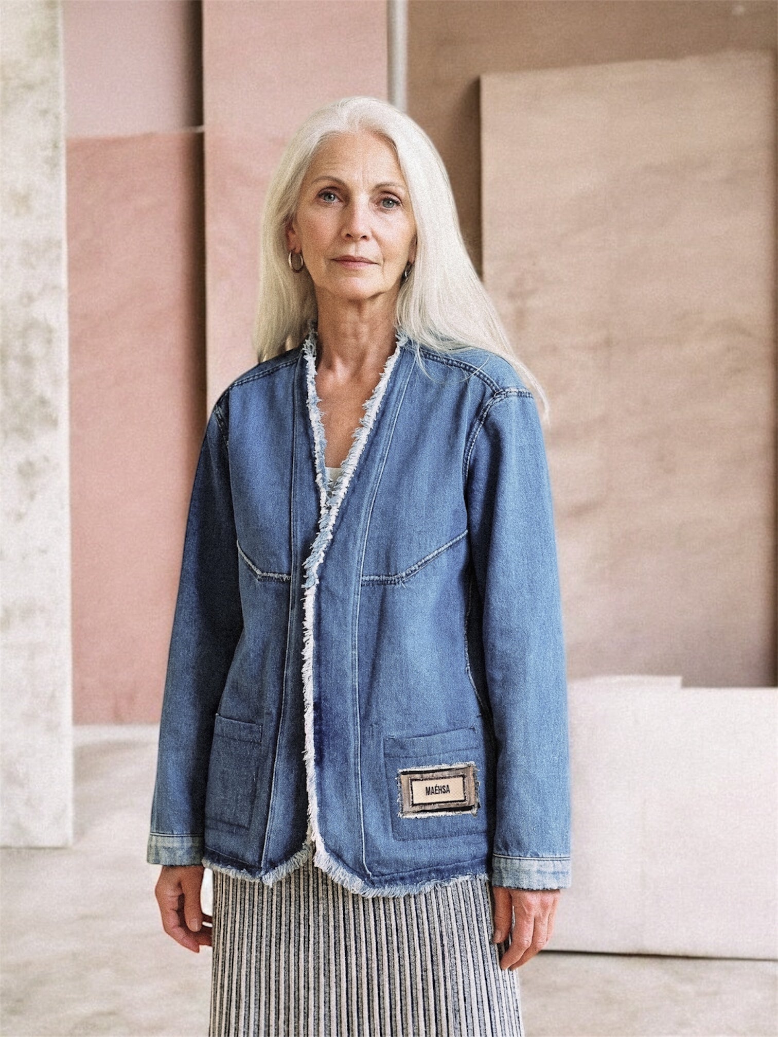 When worn on the reverse side, the AMBROISE jacket transforms into a slightly darker denim piece, offering an equally elegant and minimalist alternative. The back is accented with a light denim stripe. Both sides of the jacket are carefully finished to ensure a harmonious look, no matter how you wear it.
