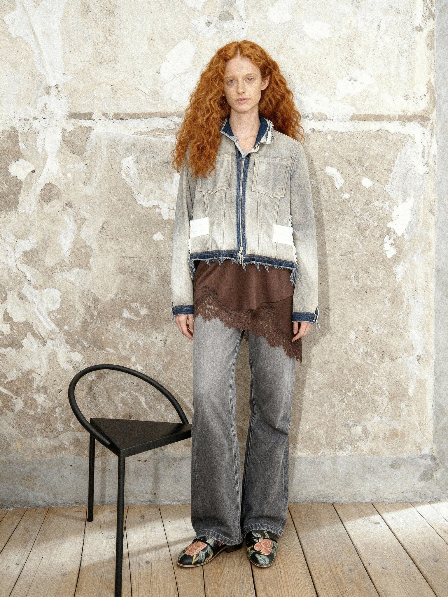 Reversible denim jacket, open on the side with silk embroidery details on the back of the sleeves.